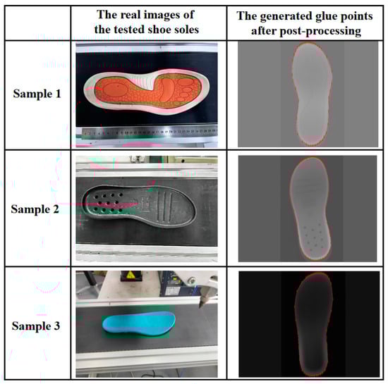 The real images of the tested shoe soles and the corresponding generated glue points after post-processing.