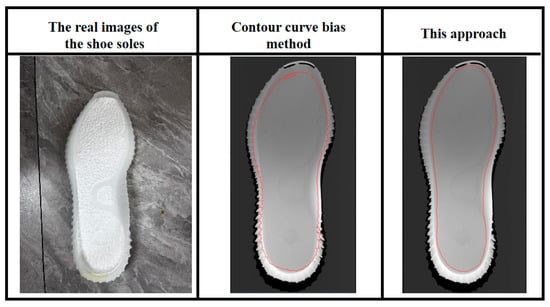 We compared our proposed method with the aforementioned approach and evaluated its performance in extracting spray trajectories. The obtained spray trajectories are shown in Figure 11. In the figure, the red point is the discrete trajectory obtained using the bias method. It can be observed that due to the inconsistency between the external contour of the shoe and the spray trajectory, the spray trajectory appears to be bent and deviates significantly from the actual spray trajectory. Furthermore, the missing information in the front part of the sole results in an additional small loop in the generated spray trajectory, which is a significant error. It can be seen that the proposed model in this study exhibits better robustness and accuracy in extracting spray trajectories of the same unique sole. It can capture subtle curve variations and edge shapes more precisely, resulting in smooth and accurate trajectories. In comparison, the method based on edge contours and offsets is more sensitive to complex sole shapes and curve variations, often leading to errors and inaccurate trajectories. Therefore, the proposed method in this study offers better robustness and reliability in practical applications, making it suitable for various types of sole spraying tasks.