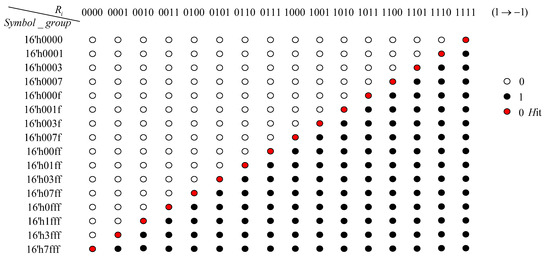 It is known that the value of determines whether requires a clockwise rotation or no rotation to approach the x axis, while approaches 0. By examining the highest sign bit of in each iteration, we can determine whether the after rotation crosses the x axis. As shown in Figure 2, the _ represents the highest sign bit of 16 branches of , and from left to right is the corresponding to from to (for the convenience of drawing, −1 is replaced by 1 here). According to Equations (3) and (8) and Table 6, the 16 branches of are arranged in ascending order. Therefore, if the left prediction branch has as a negative number (the rotation will cross the x axis), then the right prediction branch will have as a negative number. Thus, we can ascertain that the values in _ will appear in consecutive 0s or consecutive 1s. Based on this principle, in order for to approach 0 without crossing the x axis, a successful prediction must be located at the boundary between 0 and 1 in _, as indicated by the red mark in Figure 2. Subsequently, we can use the predicted rotation factor to select the corresponding and from Table 5 and Table 6. With this, one cycle of the four-step parallel branch iteration is completed.
