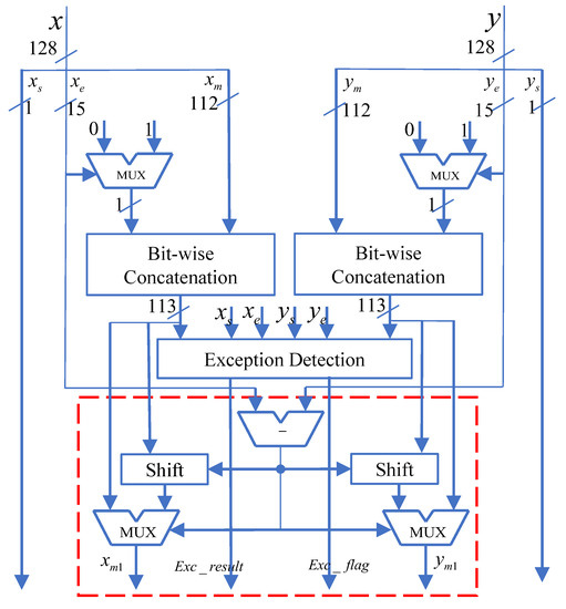 During the process of detecting exceptional and special inputs, the normalized 128-bit floating-point numbers, and , are first split into their respective components: the sign bit, the exponent part, and the fraction part with an added hidden precision bit, as shown in Figure 4. The split data is then subject to exceptional input detection. When exceptional or special inputs are detected, the Exc_flag is set to 1. The possible types of exceptional and special inputs are outlined in Table 7.