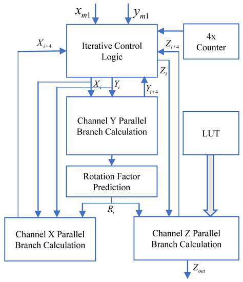 The hardware structure of the four-step parallel branch iteration module is illustrated in Figure 6. It includes a counter, iteration control logic, Y-channel parallel branch computation module, X-channel parallel branch computation module, Z-channel parallel branch computation module, lookup table (LUT), and rotation factor prediction module. In each iteration, the Y-channel first performs parallel computations for 16 predicted branches. Then, the rotation factor prediction module selects the branch in the Y-channel that is closest to zero and does not cross the x-axis, obtaining the corresponding value = . Based on , the module selects the corresponding branch results and from the X-channel and Z-channel.