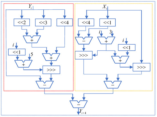 Unlike the method in Equation (2) where each of the three channels undergoes only one iteration based on the rotation factor, we adopt the concept of trading area for time and serial to parallel conversion. By performing four iterations in parallel within one clock cycle, the overall computation efficiency is improved fourfold. Below is the derivation of the four-step parallel branching iterative formula for the three channels . For channel X, after four iterations, we substitute the results into Equation (2) successively, leading to Equation (6):