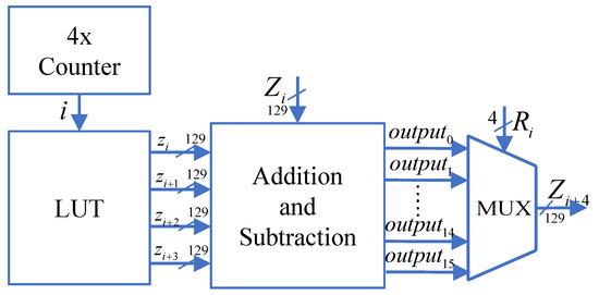 When the range of is considered to be , all its possible results fall within the range of to . As for the iterative expression of , the potential outcomes of the 16 branches are shown in Table 4. Completing these 16 branch computations requires a total of 32 additions and subtractions, 16 multiplications, and 21 shift operations.
