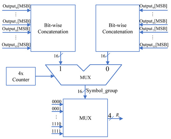 As = varies from (0, 0, 0, 0) to (−1, −1, −1, −1) incrementally, due to , the values of to , combined with the results of the 16 predicted branches in Table 6, are arranged in ascending order. However, there is a special case where exists during the first iteration, causing . As a result, in the first iteration, the highest sign bits of the two corresponding to these should be swapped to ensure that the value of Symbol_group consists of consecutive 0s and consecutive 1s. The hardware structure of the rotation factor prediction module is illustrated in Figure 9.