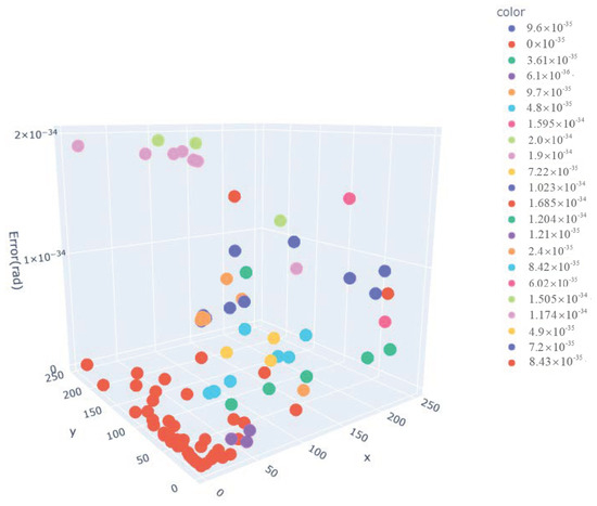 From the ideal calculation results and the actual calculation results, we randomly selected 100 sets of data to plot the error scatter diagram, as shown in Figure 13. It can be observed that among the randomly selected 100 sets of test data, the majority of the ideal calculation results have an error smaller than rad compared to the actual calculation results, with the maximum error not exceeding . Partial ideal calculation results and corresponding actual calculation results are presented in Table 10.