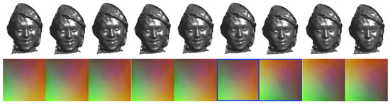 First, the mesh sequence maps each frame of the 3D-mesh to a 2D plane, frame by frame, through traditional parametrization. The position coordinates of the parameter field of the model Happy_M003 are shown in the second row of Figure 9. Since the sequence was modeled by real objects scanned by professional equipment, the vertex connectivity of each frame of mesh was different, and it could be clearly seen that the vertices were not aligned, and the details are shown in the third row of Figure 9. Then, the 3 coordinate components were resampled and interpolated into the parameter coordinates of and quantized into 14-bit-deep color geometric image components , thus generating the traditional geometric image sequence (see row 4 of Figure 9). It could be seen that in the geometric image sequence generated by traditional parametrization, although the specifications of each frame were consistent, the 3D-vertex coordinates represented by the pixel values of the corresponding pixels were not aligned.