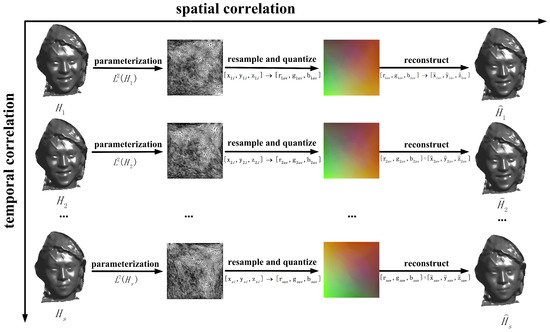 The use of mesh parametrization methods allows for the mapping of 3D meshes to 2D planes, enabling them to be effectively compressed by image-coding algorithms, such as wavelet transforms [53]. Briceño et al. [54] parameterized the selected reference frame for an artificially synthesized dynamic 3D mesh and then applied the generated parametrization result to other frames of the mesh, thus generating a geometric image sequence (geometric video). Using the geometric image sequence to normalize the 3D-mesh sequence could utilize the existing mature video-coding algorithm effectively. However, their method was only suitable for topologically isomorphic dynamic meshes, and for topologically non-isomorphic mesh sequences, the parametrization method in [54] did not work. Subsequent studies [55,56] for the parametrization of non-isomorphic mesh sequences have primarily been based on the matching of the feature blocks of the original mesh, followed by parametrization to generate geometric image sequences (e.g., typical features of human motion and facial expressions, etc.). Hou et al. [57,58] proposed a two-dimensional geometric video coding and compression framework using geometric image sequences generated by the above parametrization method, based on the premise that the low-rank features of dynamic meshes and the intrinsic structure remained unchanged.