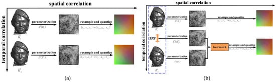 For topologically non-isomorphic 3D-mesh sequences, since the traditional parametrization method only considered the spatial correlation of the mesh sequences (refer to Figure 4a, it could not establish a corresponding relationship between the same feature vertices of the reconstructed mesh sequences, which destroyed the temporal correlations of the original mesh sequences. Therefore, we proposed the integration of the TPS transformation with the geometric-image-sequence generation process (refer to Figure 4b, to fully exploit the inter-frame correlation of the mesh sequence and effectively utilize the temporal correlations of the non-isomorphic 3D-mesh sequence in order to generate a time-dependent geometric image sequence.