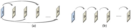 Two structures of single-reference frame parametrization (a) Use the I-frame as the reference frame (b) Use the I-frame or the previously transformed P-frame as the reference frame.