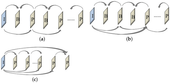 Given a non-isomorphic 3D-mesh sequence GOM of length s, , where is the set of vertex positions of the kth frame and is the set of topological triangles of the kth frame, each GOM consisted of one I-frame , multiple P-frames and B-frames . The I-frame was used as the initial reference frame for TPS transformation, and the P-frame and B-frame were used as the target frames. As shown in Figure 7, the double-reference frame parametrization sequence consisted of 3 structures: structure 1 was a P-frame using an I-frame or the previous parameterized P-frame as the reference frame, and a B-frame using an I-frame and the previous parameterized P-frame or 2 adjacent P-frames together as the reference frame; structure 2 was a P-frame using an I-frame or the previous parameterized P-frame as the reference frame, and a B-frame using an I-frame and the previous parameterized B-frame or the previous parameterized P-frame and B-frame together as the reference frame; structure 3 was a P-frame using an I-frame and the previous parameterized P-frame together as the reference frame.