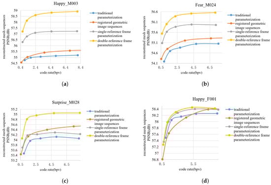 We verified the compression performance of the non-isomorphic 3D-mesh sequence based on the registration-based geometric image sequence through experiments, and the experimental results and related analysis will also be provided. We selected four face-expression sequences (Happy_M003, Fear_M024, Surprise_M028, Happy_F001) as experimental samples from the BU-4DFE face database [60], and we set the mesh sequence GOM length to be odd in order to facilitate the double-reference frame parametrization. In the experiment, we randomly selected nine frames in the mesh sequence as a GOM. In the experiment, the traditional parametrization, image registration, and the parametrization-geometry cooperative registration in this study were applied to the experimental sequence. The resolution of the generated geometric image was set to , and the up-sampling factor on the parametric mesh was 4. To the best of our knowledge, the current mature video compression technology HEVC inter-frame compression supported up to 12-bits, and H.264 inter-frame compression supported up to 14-bits, so the experiments quantized the parameter coordinates to 14-bits. After generating the geometric image sequence, it was compressed using the H.264 video-coding standard.