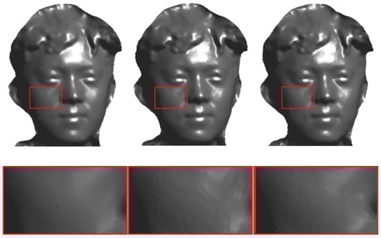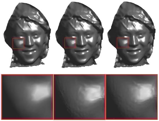 Finally, the subjective quality of the reconstructed meshes of the 2 experimental sequences is shown in Figure 11 and Figure 12. In Figure 11, the first column is the original mesh, the second column is the compressed geometric image sequence reconstruction mesh generated by traditional parametrization [53] (The total code rate of the sequence is 8.02 bpv), and the third column is the compressed geometric image sequence reconstruction mesh generated by parametrization-geometry cooperative single-reference frame registration (the total code rate of the sequence was 7.92 bpv). The first column in Figure 12 shows the original mesh, the second column is the compressed geometric image sequence reconstruction mesh generated by traditional parametrization [53] (The total code rate of the sequence is 7.54 bpv), and the third column is the compressed geometric image sequence reconstruction mesh generated by parametrization-geometry cooperative single-reference frame registration (the total code rate of the sequence was 7.23 bpv). It could be clearly seen that in the case of comparable or slightly better subjective quality, the total code rate of compressing the reconstructed 3D-mesh sequences of the geometric image sequence generated by parametrization-geometry cooperative registration was smaller than the total code rate of the geometric image sequences generated by the traditional method. It showed that the size of the compressed geometric image sequence generated by the parametrization-geometry cooperative registration was smaller than that of the geometric image sequence generated by the traditional method.