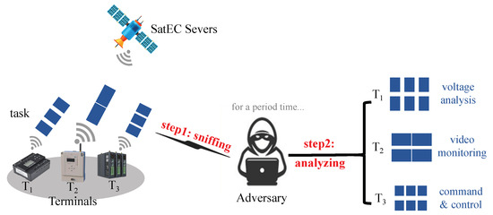 As shown in Figure 1, it only takes the following two steps. The first step is to capture computing task packets transmitted over open satellite links. There are many wireless sniffer tools that can be directly used by the adversary. For example, Zhao et al. [30] proposed NSSN, which can accurately monitor and capture data packets in wireless sensor networks. Considering the multi-hop and multi-channel characteristics, Kovac et al. [31] further designed an improved wireless sniffer. Despite the low overhead and high accuracy, ref. [31] struggled to maintain real-time sniffing for long periods. Then Sarkar et al. [32] proposed a robust sniffer which can maintain long-lived connections in real time. Based on these efforts, the adversary can obtain all the computational task packets transmitted during the sniffing period. Packets will be classified according to their source (e.g., source IP address, source MAC address), and parsed as data traffic.