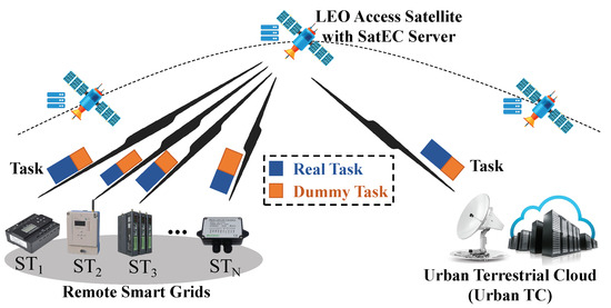 As shown in Figure 2, LEO satellites fly above the surface of Earth at high speed, and connect satellite terminals (STs) of remote smart grids to the ground station. The urban terrestrial cloud (TC) is directly connected to the ground station via an optical fiber, and its transmission delay can be ignored. We assume that the access satellite is always available, and consider N STs denoted by and a TC within the coverage of the same access satellite. Each ST sends their computational tasks to a visible LEO satellite via the terrestrial–satellite link. Particularly, aiming to protect their usage pattern privacy, STs send not only real tasks but also some random dummy tasks to confuse adversaries. After receiving tasks, the satellite decides whether to execute them directly by the local SatEC server or transmit them to the urban TC. For simplicity, we denote the wireless signal traveling from ST to its access satellite as the 1st hop, and the 2nd hop from access satellite to TC. We assume that the access satellite can measure channel states before deciding the offloading locations and allocating the bandwidth. The notations used throughout the paper are listed in the Nomenclature.