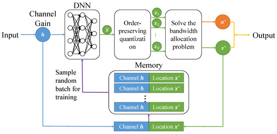 As shown in the upper part of Figure 3, in each time frame, the fully connected DNN takes the current channel gain as input, and generates a relaxed offloading location (each entry is relaxed into interval). Then, the relaxed location is quantized into K binary locations. Given a candidate location , DRTO solves a bandwidth allocation convex problem and obtains the offloading cost. Subsequently, the optimal offloading location is selected according to the minimal offloading cost.