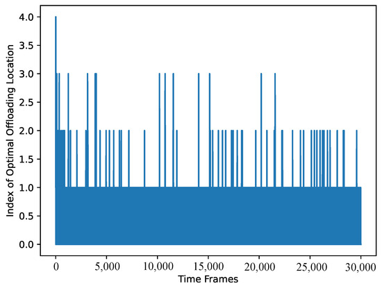 With a fixed , we plot the index of the optimal offloading location in each time frame. As shown in Figure 4, at the very beginning of the learning process, the index of the optimal offloading location is relatively large. As the offloading policy improves, we observe that most of the optimal offloading locations are the first location generated by the above order-preserving quantization method. This indicates that a large value of K is computationally inefficient and unnecessary. In other words, most of the quantized offloading locations in each time frame are redundant. Therefore, to speed up the algorithm, we can gradually adjust K, and the performance will not be compromised.