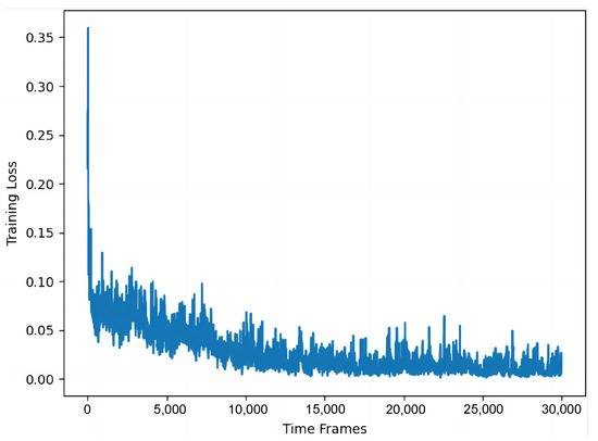 The DRTO algorithm is evaluated over 30,000 time frames. In Figure 5, we plot the training loss of the DNN, which gradually decreases and stabilizes at around , whose fluctuation is mainly due to the random sampling of the training data.