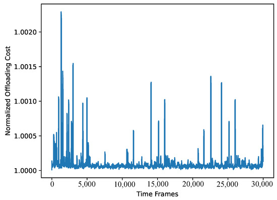 where the numerator denotes the optimal offloading cost by the DRTO algorithm, and the denominator denotes the optimal offloading cost by greedily enumerating all the offloading locations. We set the update interval . As we can see, within the first 5000 time frames, the normalized offloading cost significantly fluctuates, indicating that the offloading policy has not fully converged. Finally, most of the normalized offloading cost is converged to 1, only few frames slightly fluctuating above 1 due to the rapid channel fading when the inter-satellite handover occurs. In spite of this fluctuation, the DRTO algorithm can still achieve near-optimal offloading cost performance.