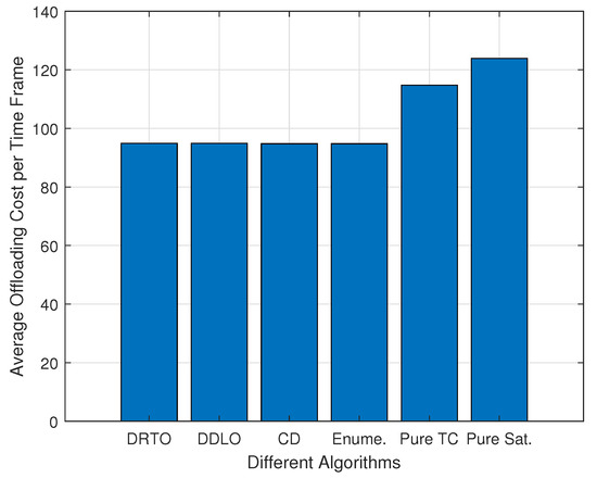 We consider STs attaching to the same access satellite. In Figure 7, we compare the performance of the average offloading cost per time frame achieved by different offloading algorithms. As we can see, DRTO achieves similar performance as the greedy enumeration method, which verifies the optimality of DRTO. Since the optimal offloading location combination is unique, any other random combinations will lead to a higher offloading cost. In addition, we see that DRTO achieves lower offloading cost with about 17.5% and 23.6% reductions compared to the pure TC computing and pure SatEC computing methods, which indicates the necessity of cooperation between SatEC servers and TCs to provide satisfying computing service.