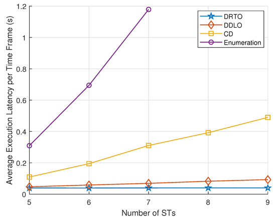 Although four dynamic algorithms achieve similar offloading cost performance (in Figure 7), DRTO consumes the lowest runtime with about 42.6%, 87.3% and 96.6% reductions compared to DDLO, CD and enumeration when . In addition, the runtime consumption of DRTO or DDLO does not explode when the network scale increases. This is because DNN can accurately fit the complex mapping from the channel states to the offloading location; compared with traditional CD or enumeration methods, the action space of DRTO or DDLO is significantly reduced, resulting in much fewer iterations. In the comparison with DDLO, at the very beginning of the learning process, the action space of DRTO is the same as that of DDLO. With the improvement of the offloading policy, the number of quantized candidate offloading locations in DRTO is dynamically adjusted, and thus the action space of DRTO is further reduced.