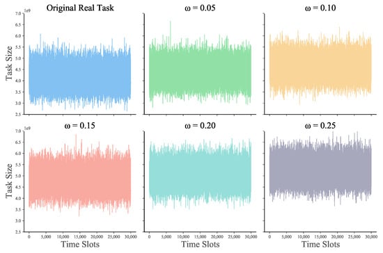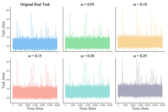 To present the performance of our privacy protection scheme, we evaluate the variability in task size and task jitter over 30,000 time slots. As shown in Figure 9 and Figure 10, five groups with different redundancy rates (i.e., , and 0.25, respectively) are implemented to compare with the original real tasks. It can be noticed that after adding redundancy packets with different , compared to the original real tasks, all the task sizes and task jitters are changed to a certain extent. Specifically, the overall envelope shapes are shown to be quite different from the original. And the spikes’ location, as well as their corresponding peak values, are also significantly altered. These demonstrate that our privacy protection scheme is able to produce noticeable perturbations in both the packet size and packet arrival interval, thus effectively misleading the adversary.