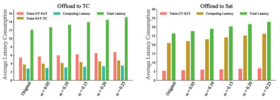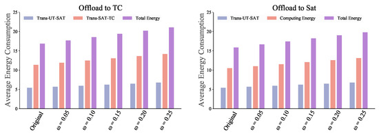As shown in Figure 11, we evaluate the average energy consumption over 30,000 time slots for five redundancy rates . It can be observed that as rises, both the transmission energy consumption (including trans-UT-SAT and trans-SAT-TC) and computational energy consumption (computing energy) tend to increase gradually, whether the task is offloaded to the satellite or to the TC. Despite this, we still believe that this is a tolerable price to pay for privacy protection since the increase in total energy consumption after adding dummy tasks is only moderate compared to the original real tasks.