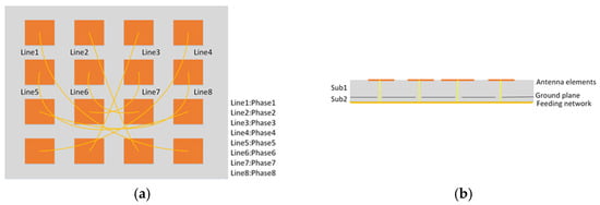 A 2D multi-layer Van Atta Array: (a) line connection pattern of the array; (b) side view of the array.