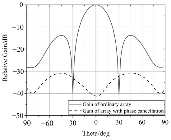 The theoretical calculation result for phase cancellation of Table 2 combination at 10 GHz is shown in Figure 3, which shows that this method can realize phase cancellation, leading to a significant reduction in the reflected wave at the incident angle. The RCS reduction can achieve more than 40 dB.