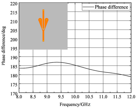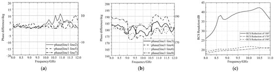 The construction of the transmission lines as the feeding network of the low-RCS Van Atta array was designed. Based on Table 2, four phase shifters were used on eight transmission lines. The phase differences between line1 and other transmission lines are shown in Figure 5a,b, indicating that all phase differences are kept within the range of ±10°. In Figure 5c, variations in RCS reduction with different phases are presented, which indicates that the RCS reduction of 180° is more than 25 dB from 8 GHz to 11 GHz, whereas it is less than 18 dB when the phase deviates 10° from 180° (i.e., 170° and 190°).