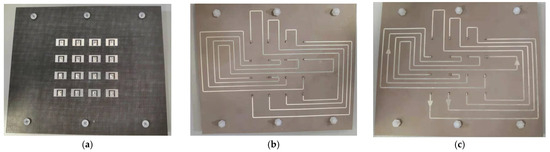 Two types of 16-element Van Atta arrays were manufactured, including a regular retrodirective multi-layer array named Array1 and a low-RCS multi-layer array named Array2. The structure of the top layer is identical for both arrays, as shown in Figure 7a. The size of the top layer is 135 mm × 115 mm × 3 mm (). The bottom layer of Array1 as the feeding network consists of eight transmission lines of the same length, whereas the bottom layer of Array2 consists of eight equal-length transmission lines with four wideband phase shifters whose phase shift is 180° ± 10° over the band of 8–11 GHz. The bottom layers of Array1 and Array2, as shown in Figure 7a,b, have the same total dimension of 135 mm × 115 mm × 0.6 mm (). The top and bottom layers of both Array1 and Array2 are integrated using metal vias.