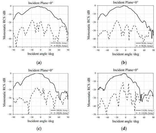 Monostatic RCS of Array1 and Array2 from 8 GHz to 11 GHz (incident plane = 0°): (a) 8 GHz; (b) 9 GHz; (c) 10 GHz; (d) 11 GHz.
