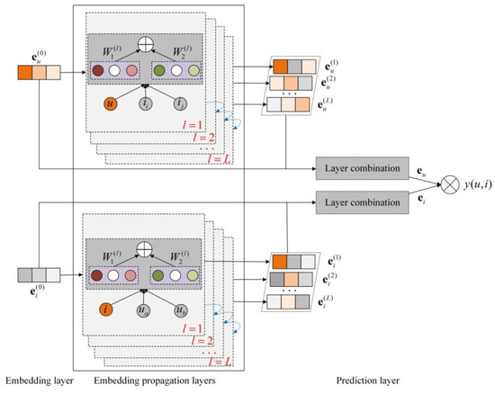 Equations (9) and (10) align the end user embedding vector that aggregates higher-order neighbor collaboration information with the embedding vectors of layer and layer . Therefore, Equation (6) can be rewritten as Equation (11).