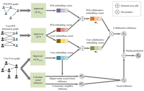 The PPR_IGCN model includes the following two parts: collaborative influence and social influence. The collaborative influence uses the improved GCN to mine higher-order collaborative information in the user check-in data, which reaches the limited convergence state of the embedding propagation layer through the loss function, in order to learn the impact of the three types of relationships represented by a user-POI interaction graph, a POI-POI graph, and a user–user graph on users’ preferences and obtain the collaborative embedding vector between user and POI. Based on the users’ social information and characteristics, social influence combines friend-based collaborative filtering with improved GCN to mine the influence of higher-order social friends and community neighbors on users’ preferences to alleviate data sparsity. The overall framework of the model is shown in Figure 2.