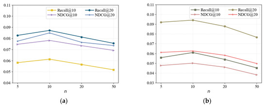 Figure 5 shows that as the value increases, the evaluation metrics display a trend of rising first and then falling. When n is 5, the performance is poor due to insufficient utilization of POI-POI and user–user relationships, ignoring a part of useful interaction influences, making it difficult to capture real user preferences. When is too large, some less similar relationships may be introduced in the learning process, making the accuracy of the recommendation decrease. Therefore, set to 10.