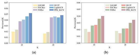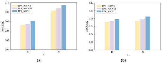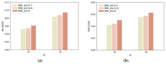 To evaluate the impact of POI-POI relations and user–user relations on the model, this section compares the experimental results of two variants of PPR_IGCN, which are PPR_IGCN-I and PPR_IGCN-II, respectively. PPR_IGCN-I only learns from the user-POI relationship graph, i.e., and of Equation (30) are set to 0, respectively. PPR_IGCN-II learns from the user-POI relationship graph and POI-POI relationship graph, i.e., of Equation (30) is set to 0.