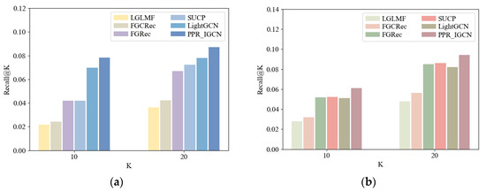 The results show that the recommendation effects of LGLMF and FGCRec are inferior to other models because these models only consider geography influence and do not consider rich context influence. FGRec introduces the inherent influence of social, category, and geographic information on users into the model, which can more accurately capture users’ preferences. Similarly, SUCP takes into account the influence of social, geographical, and temporal information, and the performance of the model is also improved. Taking the Foursquare dataset, for example, the Recall@20 of FGRec and SUCP have increased by 83.7% and 98.8%, respectively, compared with LGLMF, indicating that rich context information and multiple relationships can significantly affect model performance. However, the recommendation effect of PPR_IGCN is better than SUCP. Taking the Yelp dataset, for example, the Recall@10 of PPR_IGCN is 16.9% higher than SUCP. These show that mining higher-order collaborative information in the user–user relationship graph while considering the influence of multiple social relationships on users is more conducive to learning social influence.