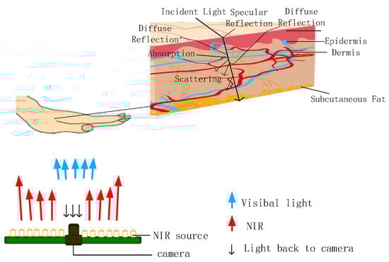 When near-infrared light (NIR) in the range of 720–1100 nm penetrates the palm, the different absorption rates of NIR radiation by various components of biological tissues result in a high absorption rate of blood hemoglobin (including oxygenated and deoxygenated hemoglobin). This leads to the formation of observable shadows, allowing the identification of vein locations and the generation of palm vein images [3]. Due to the reflection, scattering, or fluorescence in different tissues of the palm, the optical penetration depth varies from 0.5 mm to 5 mm. Vein acquisition devices [2] can only capture superficial veins, and palm vein images are typically obtained using a reflection imaging approach. To improve user acceptance and enhance comfort during palm vein recognition, open environment capture is employed, which un-avoidably introduces visible light (390–780 nm) illuminating the palm and entering the imaging system, resulting in the acquisition of multi-spectral palm vein images. As shown in Figure 1, visible light entering the skin increases light scattering, thereby interfering with clear palm vein imaging [22].