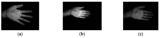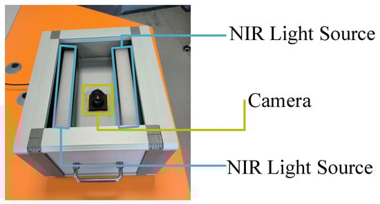 The self-developed non-contact palm vein image acquisition device in an open environment is shown in Figure 2. To enhance the absorption of near-infrared light by palm veins and minimize interference from visible light, the device employs two CST brand near-infrared linear light sources, model BL-270-42-IR, with a wavelength of 850 nm. These light sources are equipped with an intensity adjustment controller. The device uses an industrial camera, model MV-VD120SM, for image capture. The captured images are grayscale with a resolution of 1280 pixels × 960 pixels and 8 bits.