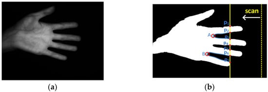 The ROI extraction process is illustrated in Figure 3. Firstly, the original image (Figure 3a) is denoised using a low-pass filter. Then, the image is binarized, and the palm contour is extracted using binary morphological dilation, refining it to a single-pixel width. Vertical line scanning is performed from the right side to the left side of the image, and the number of intersection points between the palm contour and the scan line is counted. When there are 8 intersection points, it indicates that the scan line passes through four fingers, excluding the thumb. From the second intersection point, p2, to the third intersection point, p3, the palm contour is traced to locate the valley point, point A, between the index finger and the middle finger (Figure 3c), using the disk method [2]. Similarly, between p6 and p7, the valley point, point B, between the ring finger and the little finger is located. Points A and B are connected, forming a square ABCD on the palm with the side length equal to the length of AB, denoted as d. This square is then grayscale normalized and resized to a size of 128 pixels × 128 pixels, resulting in the desired ROI, as shown in Figure 3d.