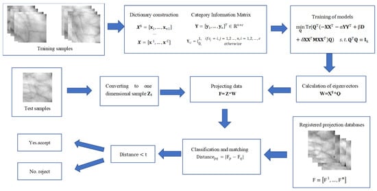 The final proposed method, SDSPCA-NPE, introduces local structural information to address the limitations of SDSPCA, which only considers global and class information in supervised learning. By incorporating sparse constraints and class information, the resulting feature vectors exhibit strong interpretability and sensitivity to class information, effectively reducing the impact of lighting variations in palm vein images and improving the problem of high inter-class similarity. This leads to better inter-class distances. Additionally, the method preserves the local structural information of the data during projection, maintaining certain neighborhood relationships from the original palm vein data. This enhances tolerance for non-uniformly distributed outliers and reduces intra-class distances. As a result, the final palm vein feature vectors demonstrate improved classification performance, with increased inter-class distances and decreased intra-class distances in terms of distance distribution. Figure 5 provides an overview of the proposed method.