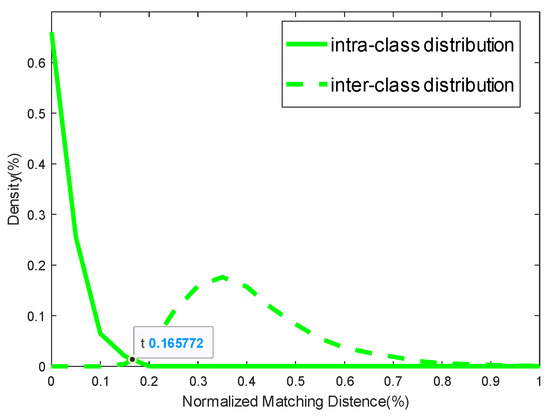 Figure 6 shows the distribution of the Euclidean distances between the feature vectors of the palm vein images for intra- and inter-class matching. The solid line is the intra-class distance distribution, and the dashed line is the inter-class distance distribution. The t-value corresponding to the intersection point is 0.165, representing a matching threshold of t = 0.165. The threshold ‘t’ is subject to variation, and it may differ for different databases.