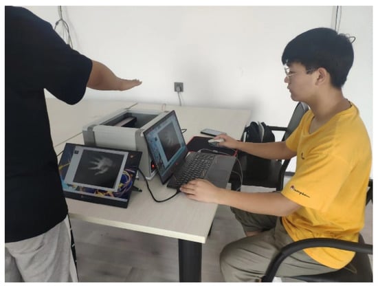- Self-built image databases: The self-developed device for palm vein image acquisition shown in Figure 2 was used for shooting, and the acquisition environment is shown in Figure 7. Two hundred and sixty-five palm images of the left and right hands of 265 people were collected. The left and right hands of the same person were regarded as different samples. In total, 530 palms were captured, with 10 images taken for each hand, resulting in a total of 5300 images. In the scope of the 5300 images we collected, the FTE rate of our device is 0%.