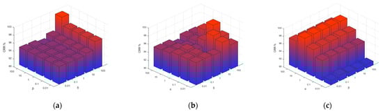 Performance index and parameter relationship: (a) β and δ; (b) α and δ; (c) α and β. The blue to red gradient represents the CRR from low to high.