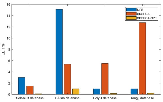 From Table 1 and Figure 14, it can be observed that sub-space methods, such as the SDSPCA-NPE algorithm, outperform other texture-based methods in terms of time efficiency. In terms of specific performance, the algorithm achieves superior results across four databases, with the best CRR and EER performance. It also exhibits better time complexity compared to the majority of methods. However, it should be noted that certain methods show lower time complexity and even better EER performance on individual image databases. Nonetheless, these algorithms lack universality and are not applicable for distinguishing palm vein images, especially when dealing with non-uniformly distributed palm vein databases.