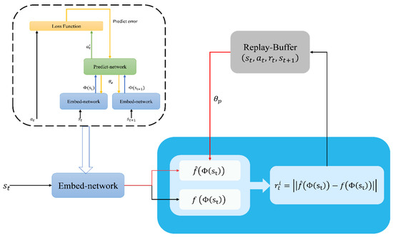 Therefore, the training phase of the prediction task needs to be divided into two parts: (1) Embedding network update: the interaction data between the agent and the environment is obtained by sampling from the Replay-Buffer, and the parameter of the feature embedding network is optimized according to the error of the action prediction; (2) Prediction network update: the parameter of the embedding network is fixed, and the parameter of the prediction network is optimized according to the generated exploration reward error (Formula (4)). The formula of the loss function can be rewritten as: