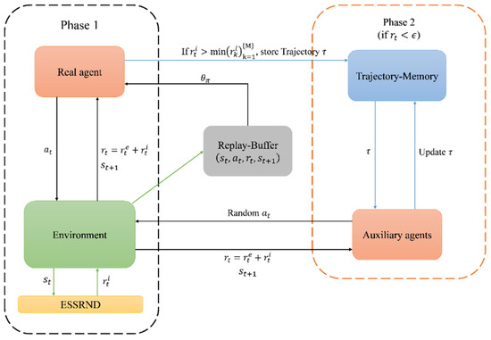 The agent training framework (Figure 3) proposed in this paper can be divided into two stages: In stage one, the original training method is adopted. The agent continuously interacts with the environment, generates exploration rewards based on prediction errors through the ESSRND module, stores all interaction data in the Replay-Buffer, and updates the agent strategy by sampling selected data in the subsequent process. For a state and trajectory with high novelty, it needs to be stored in the Trajectory-Memory according to the rules. Trajectory-Memory is a storage space of size M. In the process of interaction between the agent and the environment, the stored judgment is made according to the following formula: