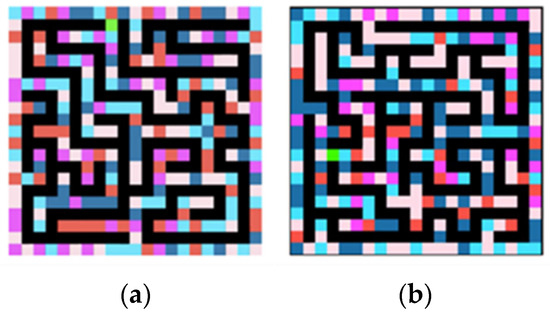 The random noise maze is a 21 × 21 grid maze, in which the green square represents the agent, the black represents the passage in the maze, and other colors (including five colors in total) represent the walls. The maze is regenerated every time it is initialized. The agent can choose four actions: left, right, up, and down, and the walls of the maze undergo random color changes after each action. When the agent touches the wall, it directly restarts the next round. (a,b) represent different moments in the maze.