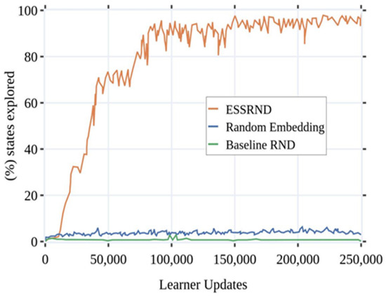 In the experiment, the ratio of the explored space to the total size of the state space is used as the evaluation index of the agent’s exploration ability. The experimental results are shown in Figure 5. Due to the effect of color transformation in the environment, both the randomly embedded features (blue) and the original RND (green) are trapped in white noise, and cannot learn an effective policy. Optimizing feature embedding (orange) can filter out the influence of white noise and increase the exploration utilization rate of the environment as the number of agent interaction steps increases, allowing the gradual learning of useful strategies. Our method can effectively alleviate the white noise problem in the training environment. Compared with random feature embedding and original RND, ESSRND can not only filter out the environment features irrelevant to the agent through optimized feature embedding, but also reach convergence.