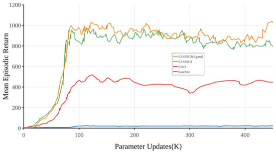 We conducted comparative experiments in the Montezuma’s Revenge experimental environment, mainly comparing the performance of E2S2RND and the original RND method, and the experimental results are shown in Figure 6. As can be seen from the figure, our proposed ESSRND method (green) and the auxiliary agent training framework E2S2RND (orange) have a significant performance improvement compared to the original RND method (red). Moreover, the convergence speed of our method during the training process is also slightly improved compared with the original RND method. E2S2RND has higher rewards than ESSRND in most parameter update steps, and E2S2RND maintains a certain upward trend compared with the peak value of ESSRND. It can be seen that after applying the E2S2RND algorithm training framework, the performance of the agent is still subject to a degree of performance improvement.