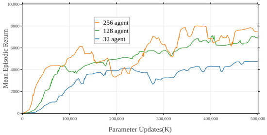 Experimental results in Montezuma’s Revenge. We used three numbers of auxiliary agents for comparative experiments, including 256 agents (orange), 128 agents (green), and 32 agents (blue), where the horizontal axis represents the model parameter update step, and the vertical axis represents the average return reward of the main agent.